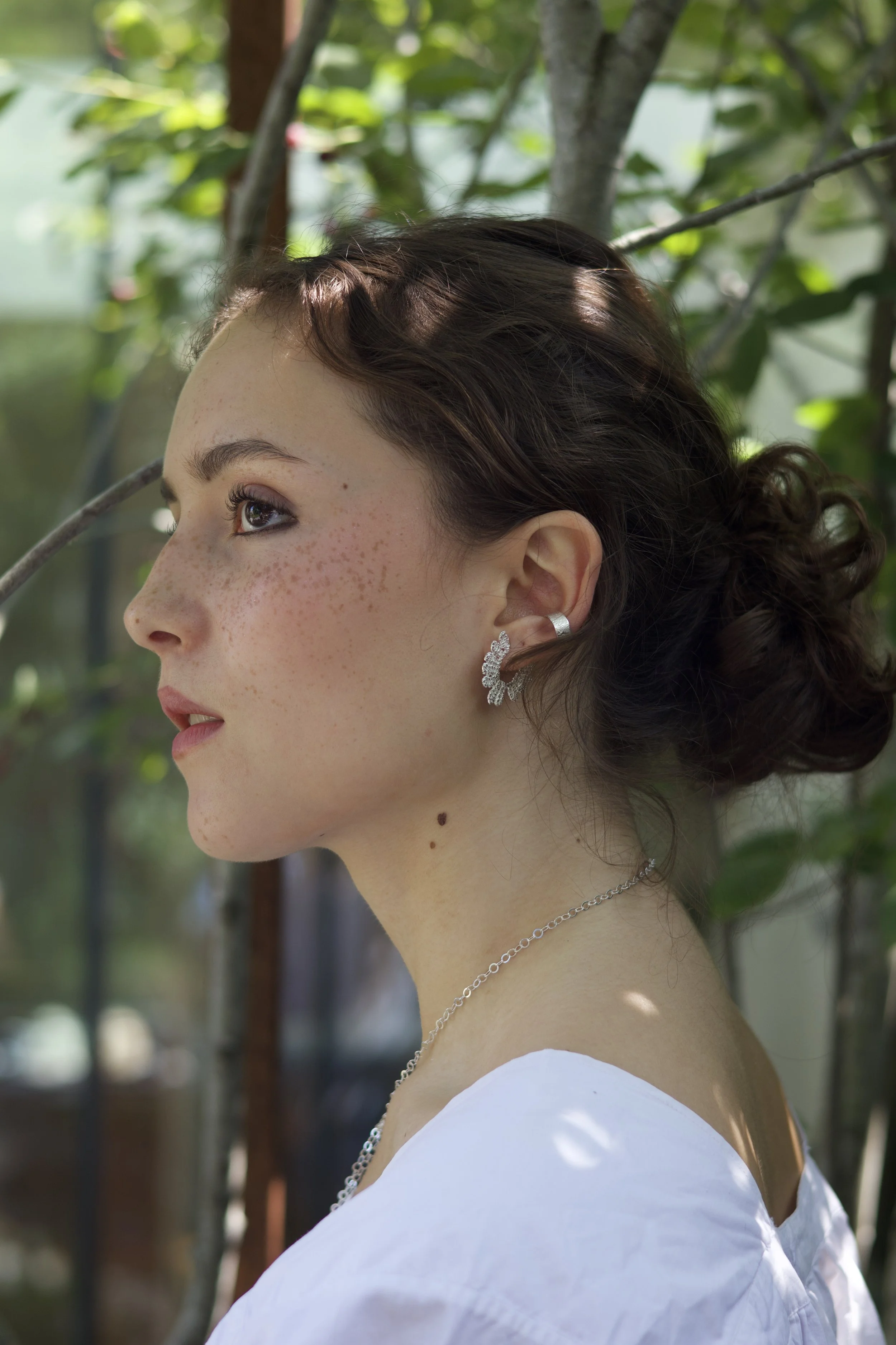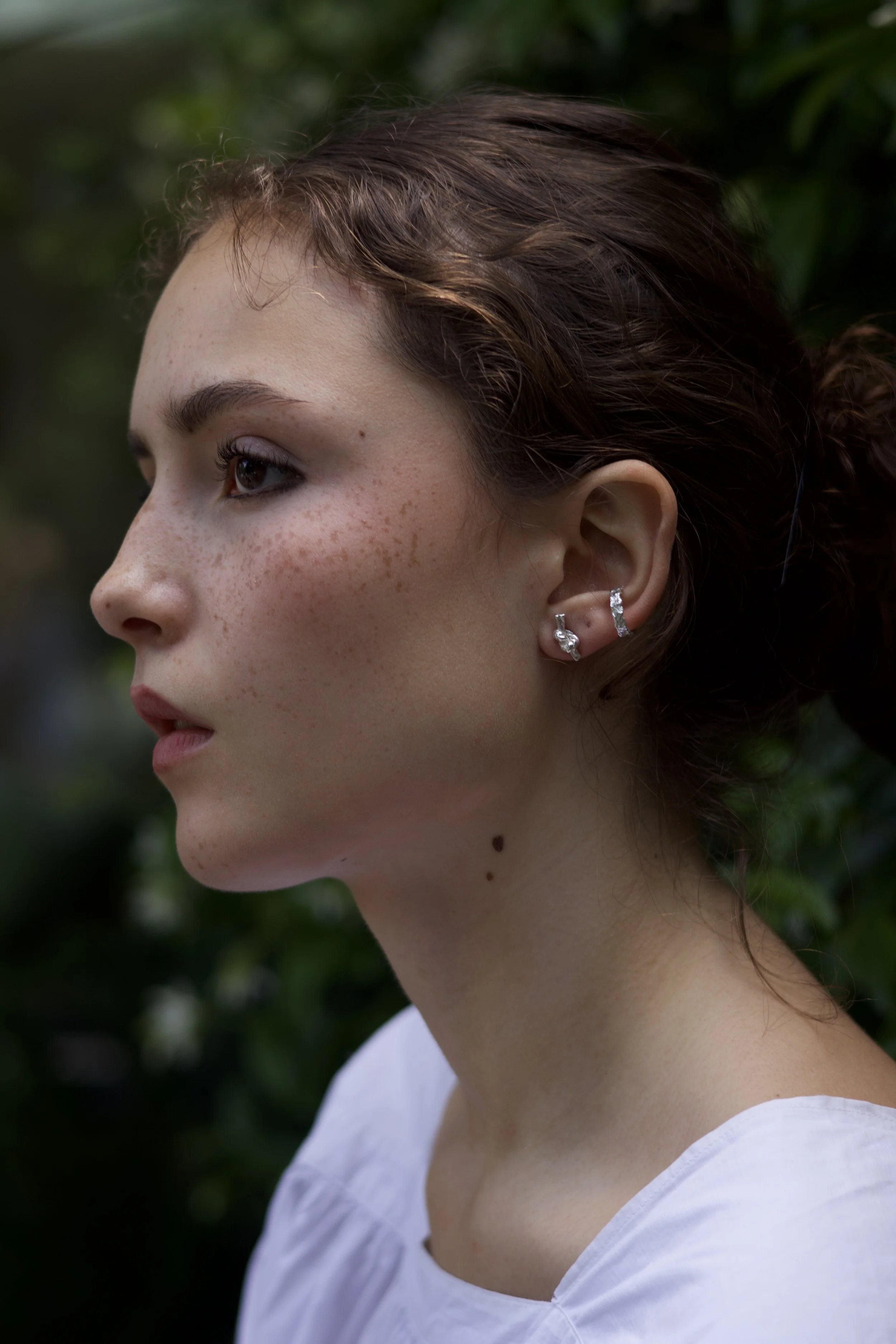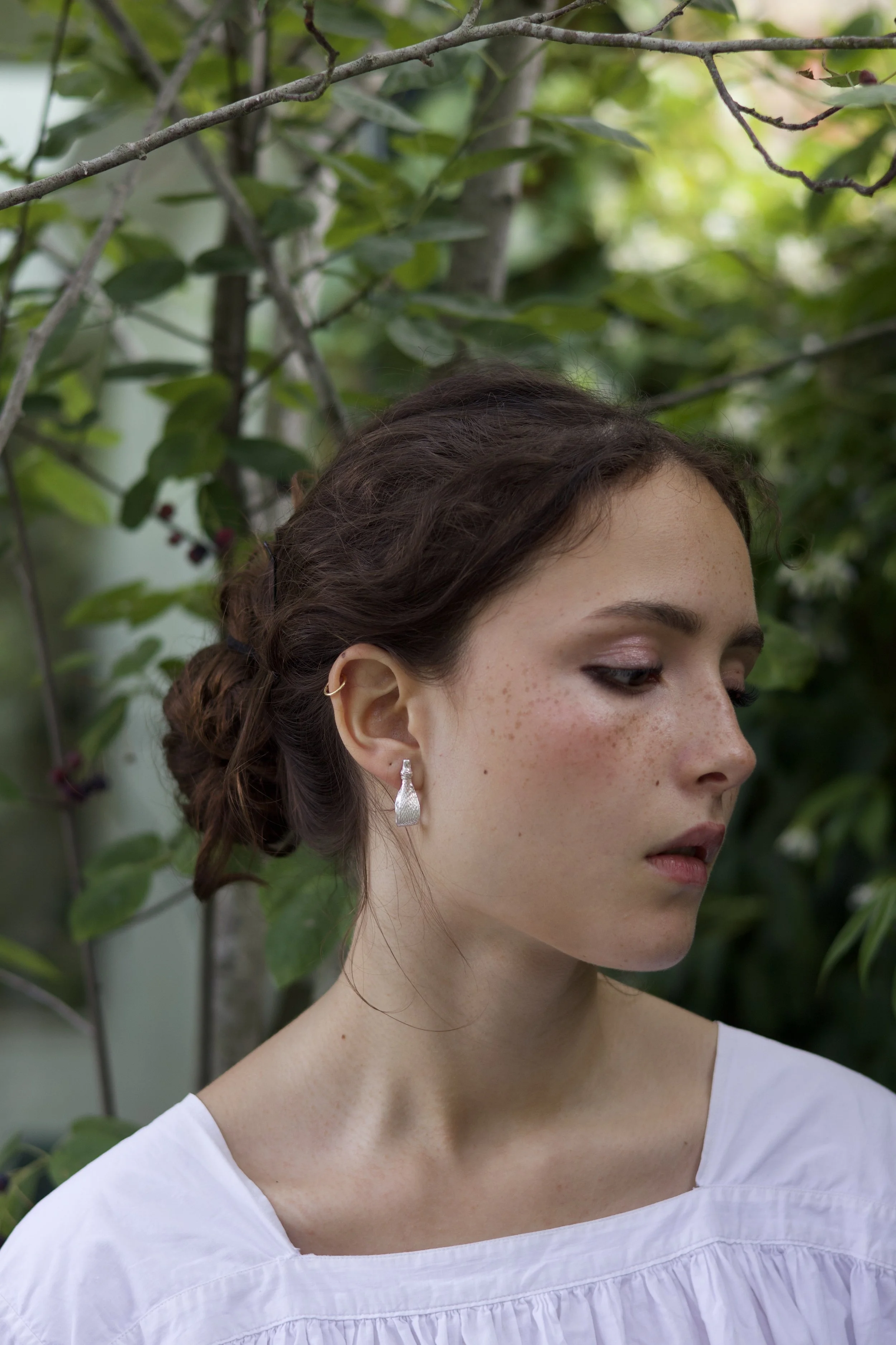 From simple studs to sculptural drops, each earring captures movement and light. Textural silver forms that frame the face with simplicity.