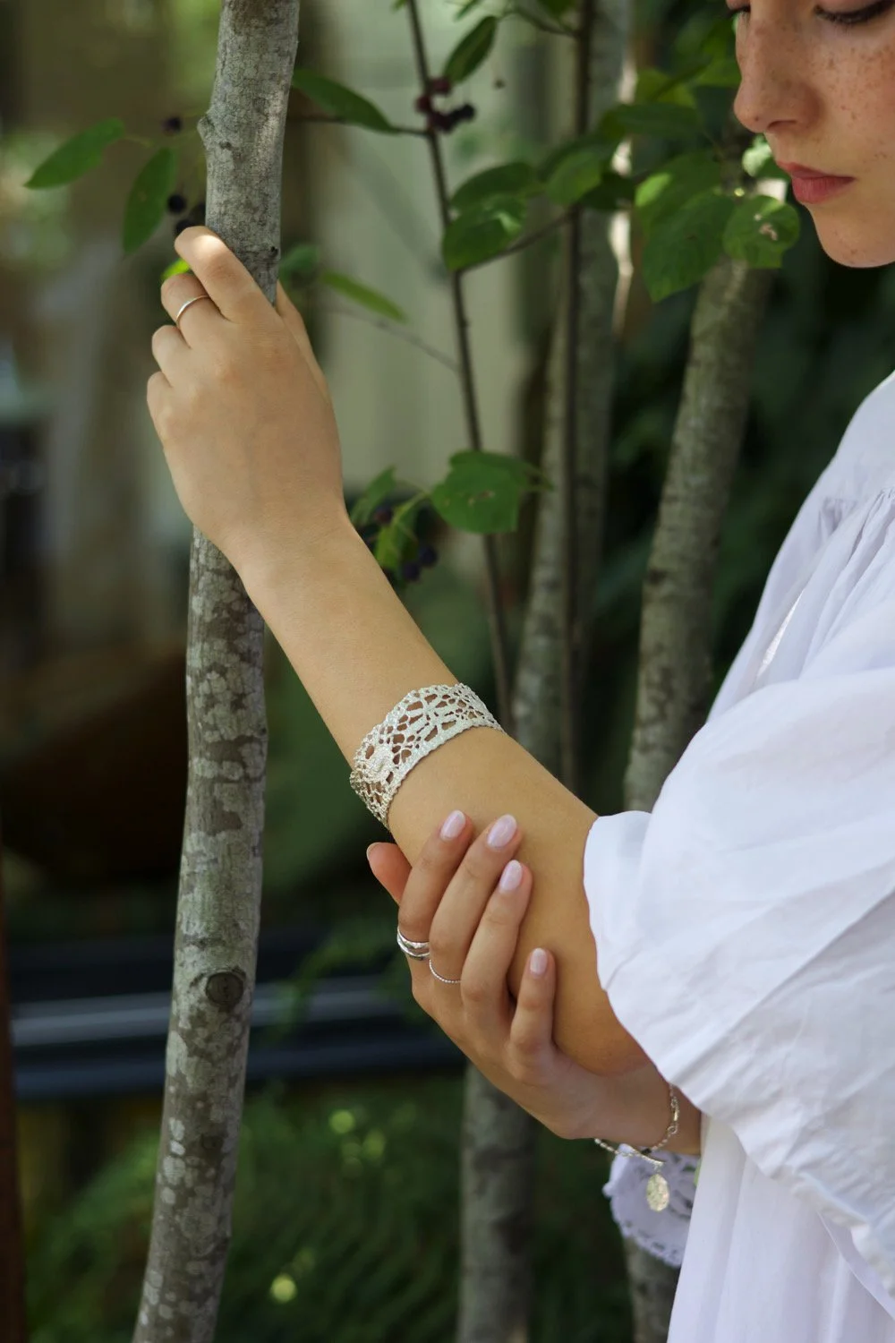 A woman with light skin and freckles is holding a tree branch. She is wearing a white lace bracelet, multiple rings, and a silver bracelet. She has short, light brown hair and is wearing a white top. The setting appears to be outdoors with green leaves and branches around her.