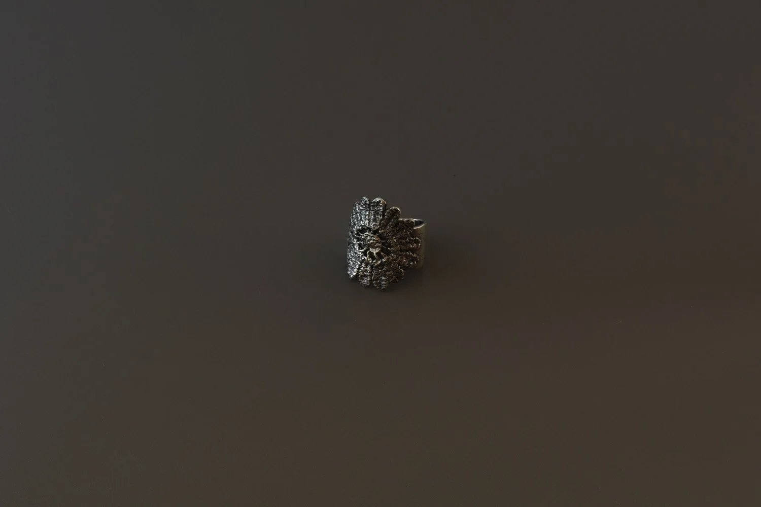 A silver ring with a large, detailed floral or organic design on a plain brown background.