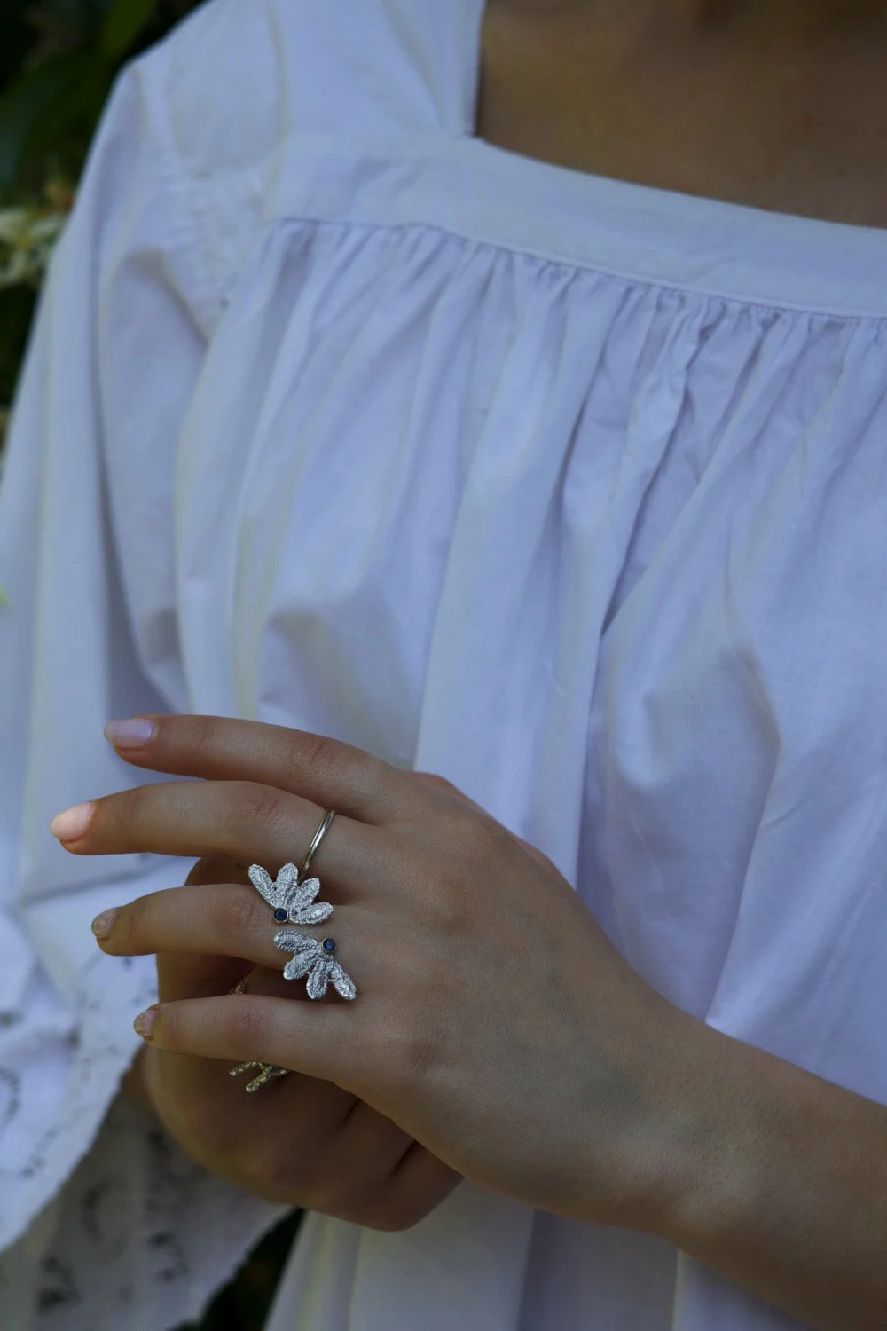 Close-up of a woman's hand wearing a butterfly-shaped ring with blue gemstones, against a background of white dress fabric and some greenery.