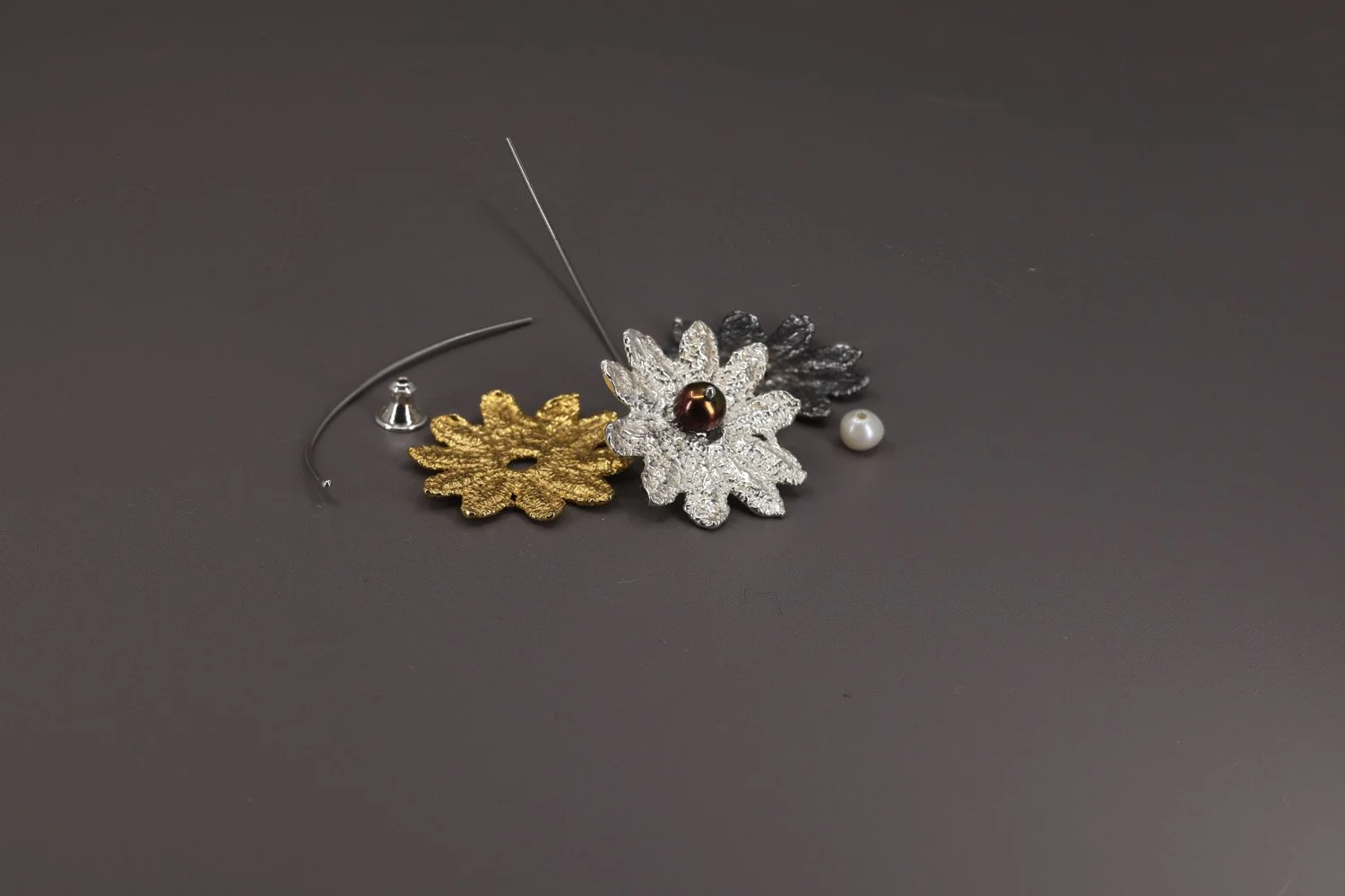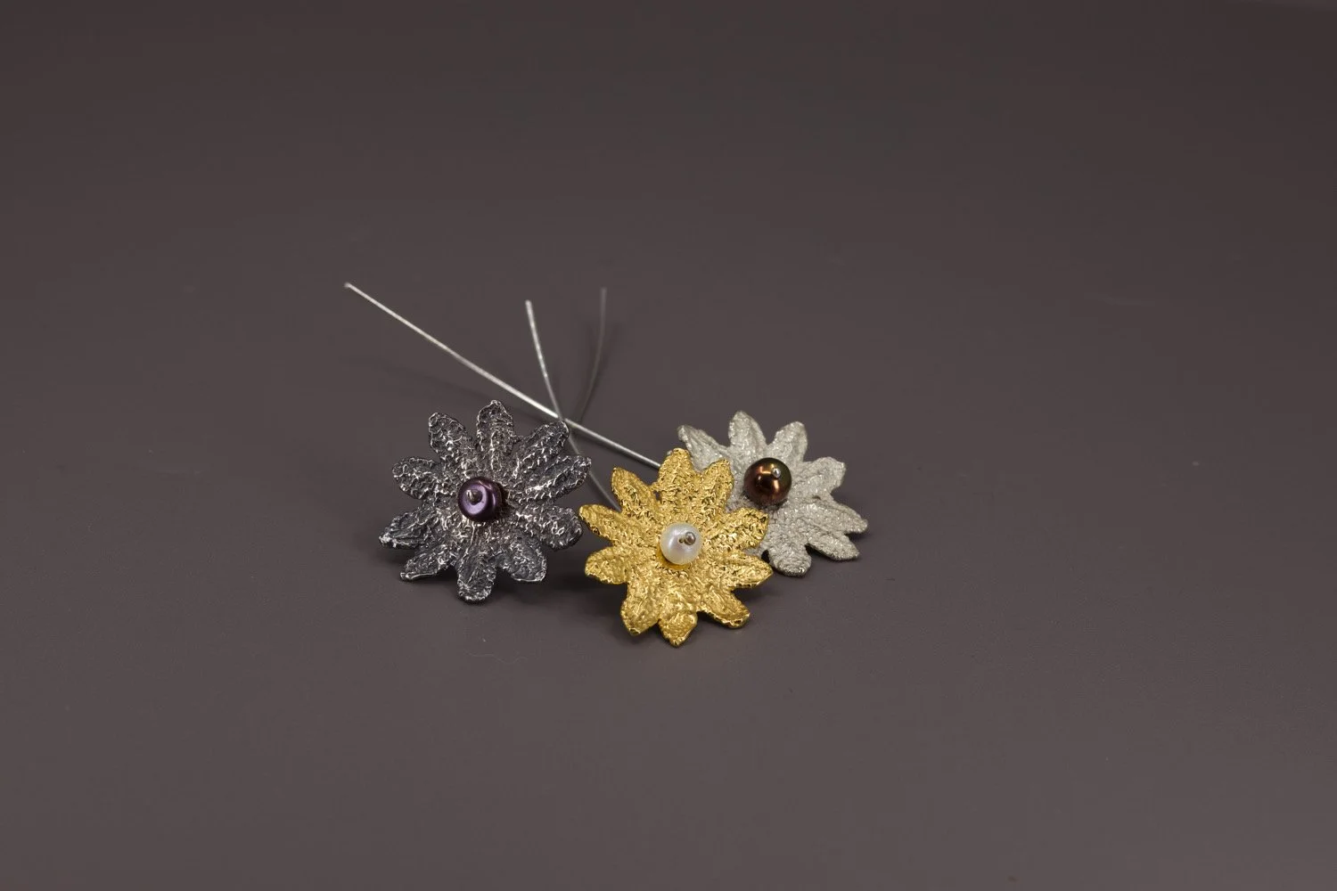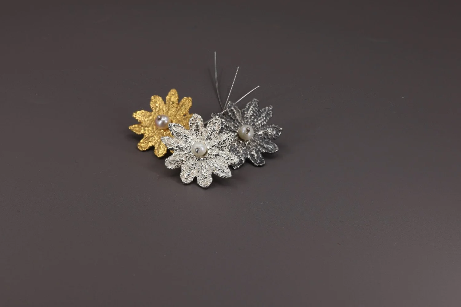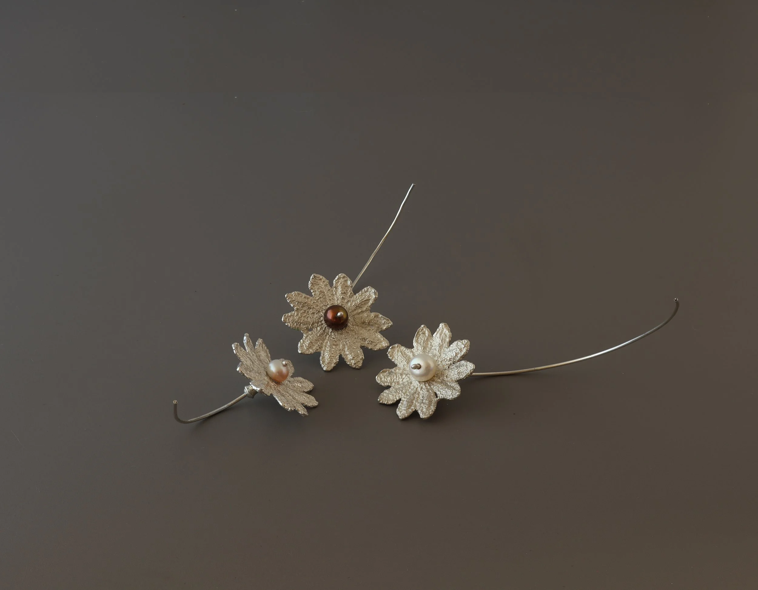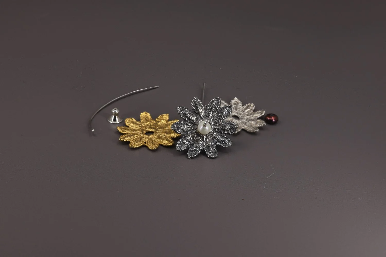 Wing-like fragments of lace, cast into silver, hold luminous freshwater pearls or other gemstones at their centre. The pairing of rugged texture and soft iridescence embodies the spirit of Woven Memory: fragility preserved, transformed into jewellery that is both delicate and strong.